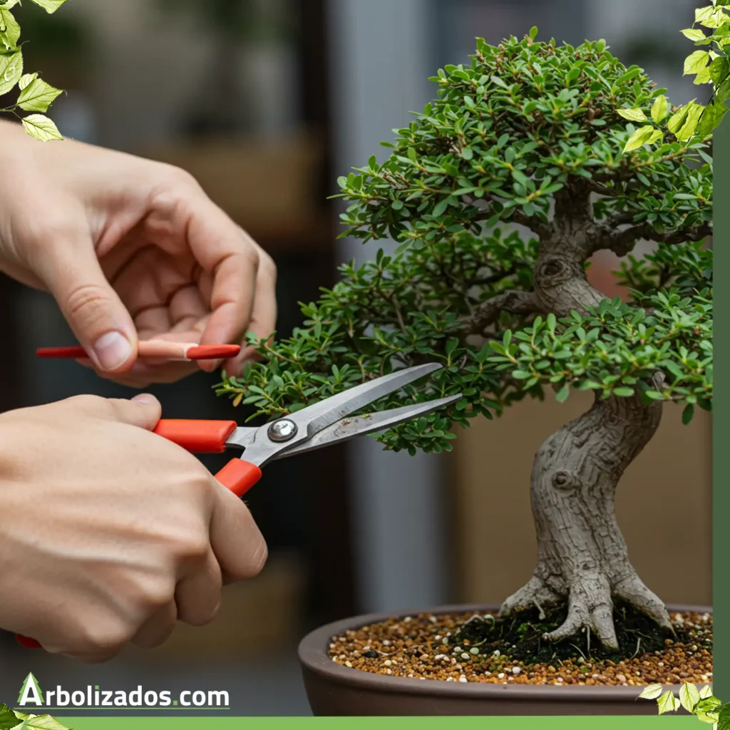 La poda es esencial para dar forma al bonsái y controlar su crecimiento. Hay dos tipos principales de poda: la poda de formación, que da forma a la estructura básica del árbol, y la poda de mantenimiento, que controla el crecimiento excesivo y mantiene la forma deseada.