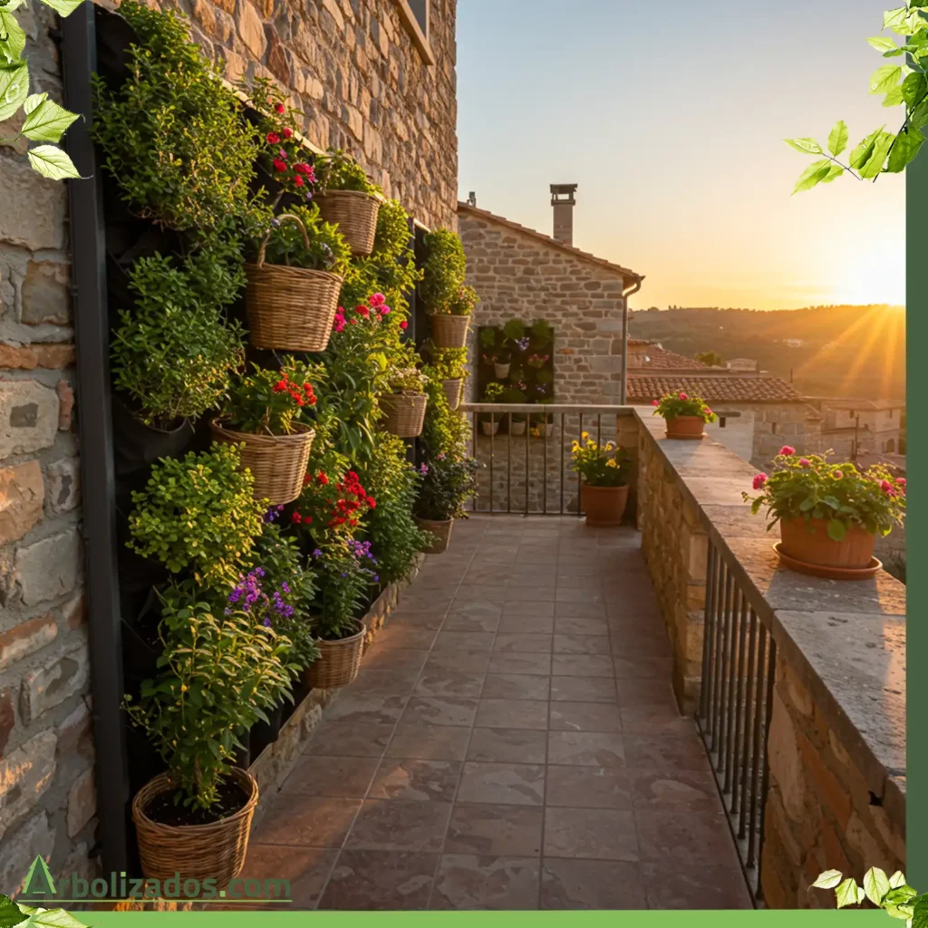 Integra hierbas aromáticas (romero, tomillo) en el jardín vertical: aportan fragancia y son comestibles. Las texturas de piedra y madera sin tratar refuerzan el carácter campestre.