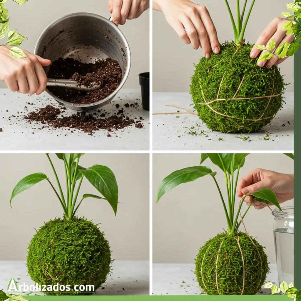Selecciona plantas de crecimiento lento (p. ej. Zamioculca, Fittonia) para que la forma esférica dure más. En cenas especiales, coloca la kokedama sobre un plato raso de cerámica blanca y rodea con pétalos secos aromáticos: armonía visual y fragancia suave en un solo gesto.