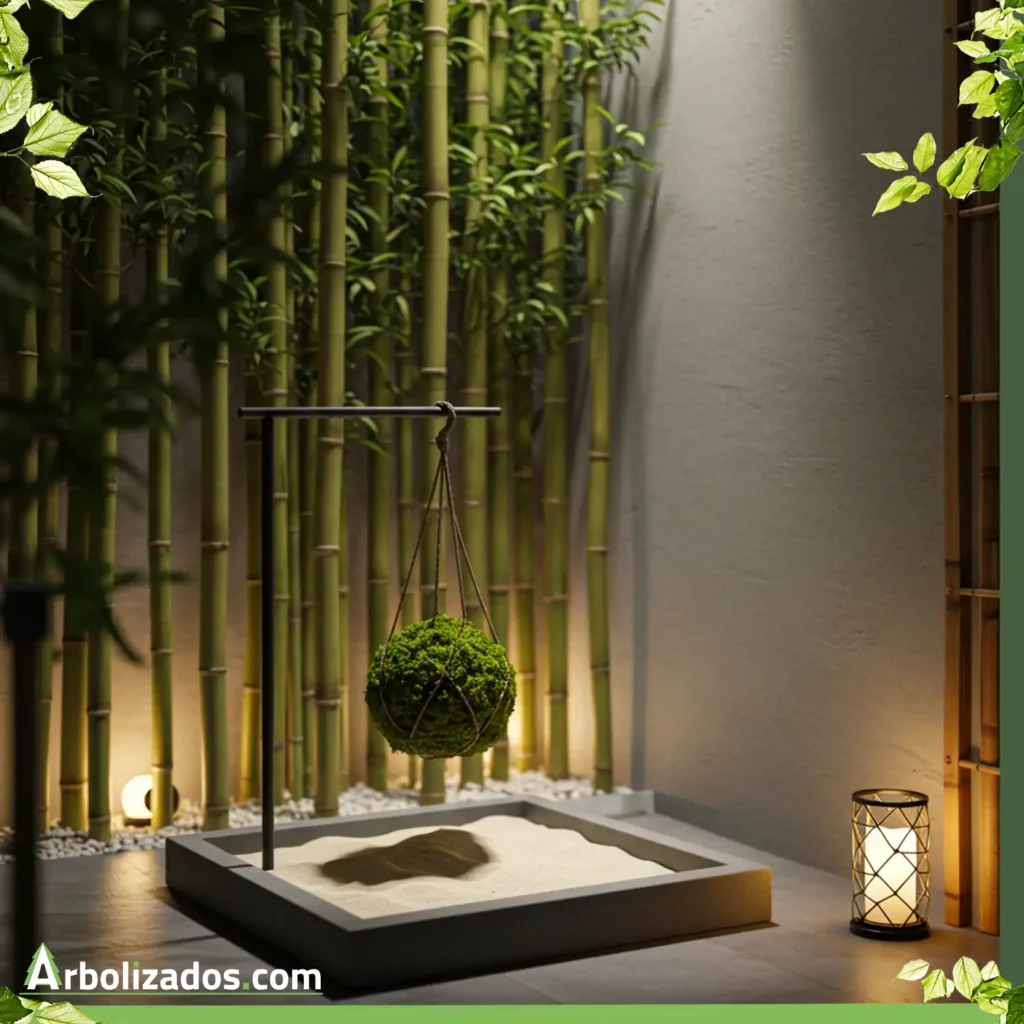 Coloca la kokedama en una bandeja de arena rastrillada y usa bambú y aspidistra en el panel vertical. Agrega una luz cálida de 3 000 K apuntando desde abajo para enfatizar los juegos de sombra al anochecer.