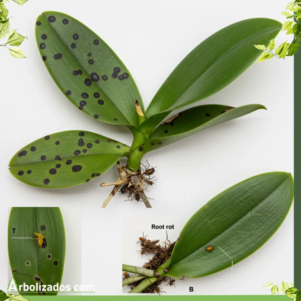 Las orquídeas pueden ser afectadas por diversas enfermedades y plagas. Las infecciones fúngicas y bacterianas son comunes, manifestándose como manchas negras o pudrición en las hojas y raíces. Las plagas más frecuentes incluyen ácaros, cochinillas y pulgones.