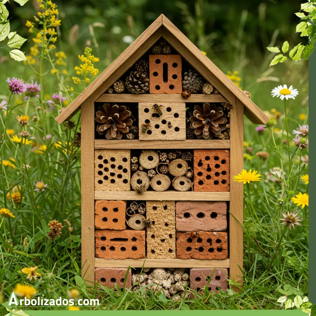 Las casas para insectos proporcionan refugio a abejas solitarias, mariquitas y otros insectos beneficiosos. Estas estructuras pueden ser compradas o hechas en casa con materiales naturales como bambú, troncos y ladrillos huecos.