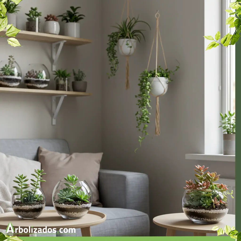 Prueba terrarios abiertos combinando arena de colores y piedras volcánicas para resaltar contrastes; o crea cuadros vivos con marcos de madera y mallas de gallinero, ideales en paredes muy luminosas.