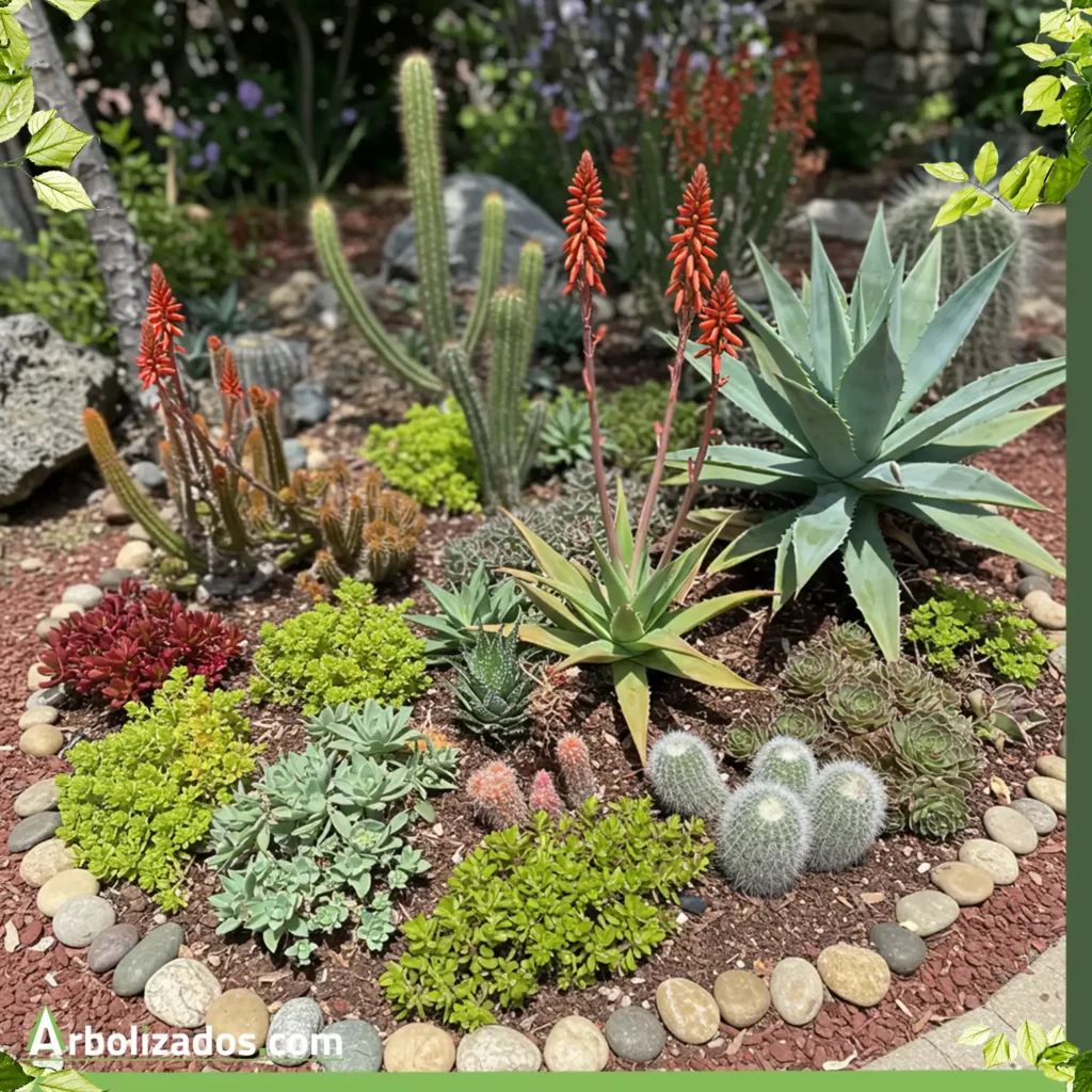 Un lecho elevado lleno de grava volcánica calentará el suelo y favorecerá el drenaje, evitando pudriciones en zonas lluviosas. Integra cactus columnares como “guardianes” verticales para dar sombra parcial a especies de porte bajo.